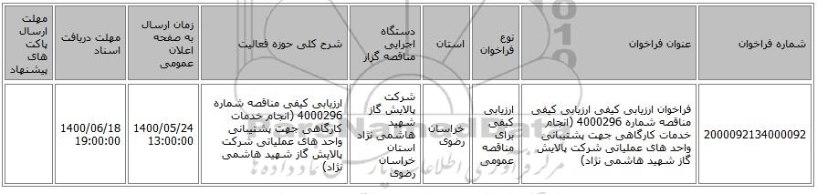 | 2000092134000092 | فراخوان ارزیابی کیفی ارزیابی کیفی مناقصه شماره 4000296 (انجام خدمات کارگاهی جهت پشتیبانی واحد های عملیاتی شرکت پالایش گاز شهید هاشمی نژاد) | ارزیابی کیفی برای مناقصه عمومی | خراسان رضوی | شرکت پالایش گاز شهید هاشمی نژاد استان خراسان رضوی | ارزیابی کیفی مناقصه شماره 4000296 (انجام خدمات کارگاهی جهت پشتیبانی واحد های عملیاتی شرکت پالایش گاز شهید هاشمی نژاد) | 1400/05/24 13:00:00 | 1400/06/18 19:00:00 |