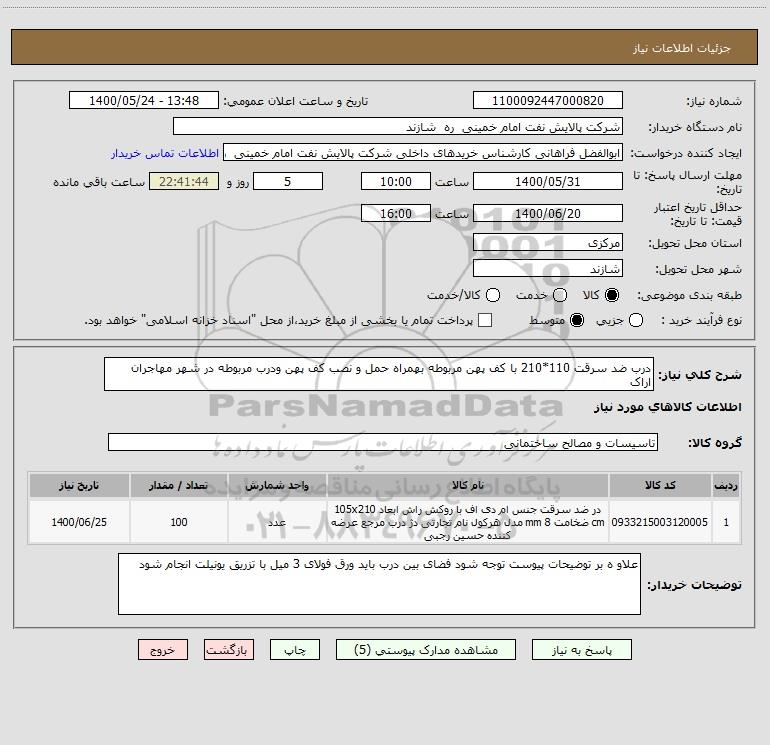 استعلام درب ضد سرقت 110*210 با کف پهن مربوطه بهمراه حمل و نصب کف پهن ودرب مربوطه در شهر مهاجران اراک, استعلام درب ضد سرقت 110*210 با کف پهن مربوطه بهمراه حمل و نصب کف پهن ودرب مربوطه در شهر مهاجران اراک