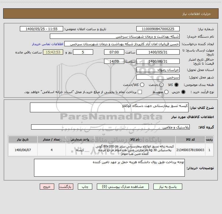 شرح کلی نیاز: کیسه نسوز بیمارستانی جهت دستگاه اتوکلاو