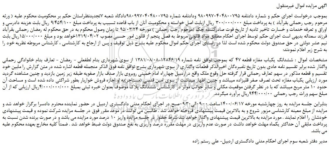 شعبه صادر کننده:شعبه سوم اجرای احکام مدنی دادگستری شهرستان اردبیل