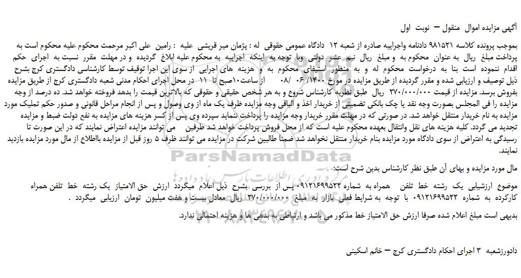 بموجب پرونده کلاسه 981521 دادنامه واجراییه صادره از شعبه 12  دادگاه عمومی حقوقی  له : پژمان میر قریشی  علیه  : رامین  علی اکبر مرحمت محکوم علیه محکوم است به پرداخت مبلغ  ریال  به عنوان  محکوم به  و مبلغ  ریال  نیم  عشر  دولتی  وبا  توجه به  اینکه  اجراییه  به محکوم علیه ابلاغ  گردیده  و در مهلت  مقرر  نسبت به  اجرای  حکم  اقدام  ننموده  است  بنا  به  درخواست  محکوم  له  و  به  منظور  استیفای  محکوم  به  و  هزینه  های اجرایی  از سوی این اجرا توقیف توسط کارشناسی دادگستری کرج بشرح ذیل توصیف و ارزیابی شده و مقرر گردیده از طریق مزایده در مورخ 1400/ 06  /08      از ساعت10صبح تا  11  در محل اجرای احکام مدنی شعبه دادگستری کرج از طریق مزایده بفروش برسد. مزایده از قیمت 270/000/000  ریال  طبق نظریه کارشناس شروع و به هر شخص حقیقی و حقوقی که بالاترین قیمت را بدهد فروخته خواهد شد. ده درصد از وجه مزایده را فی المجلس بصورت وجه نقد یا چک بانکی تضمینی از خریدار اخذ و الباقی وجه مزایده ظرف یک ماه از وی وصول و پس از انجام مراحل قانونی و صدور حکم تملیک مورد مزایده به نام خریدار منتقل خواهد شد. در صورتی که در مهلت مقرر خریدار وجه مزایده را پرداخت ننماید سپرده وی پس از کسر هزینه های مزایده به نفع دولت ضبط و مزایده تجدید می گردد. کلیه هزینه های نقل وانتقال بعهده محکوم علیه است که از محل فروش پرداخت خواهد شد طرفین    می توانند مزایده اعتراض نمایند که در این صورت تا رسیدگی به اعتراض از سوی دادگاه مورد مزایده بنام خریدار منتقل نخواهد شد ضمنا طالبین شرکت در مزایده می توانند ظرف 5 روز قبل از مزایده بااطلاع از مال مورد مزایده بازدید نمایند.