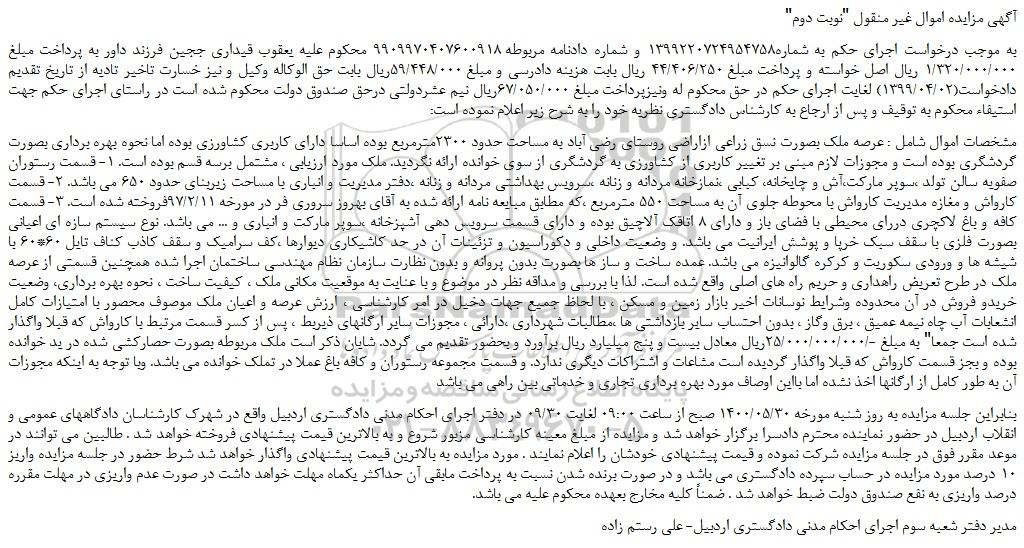 "آگهی مزایده اموال غیر منقول "نوبت دوم