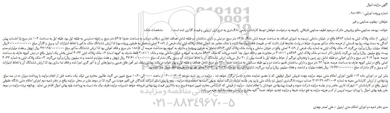 خوانده : یوسف صنایعی،حکم برفروش ماترک مرحوم لطیف صنایعی قنبلانی باتوجه به درخواست خواهان توسط کارشناس رسمی دادگستری به شرح ذیل ارزیابی و قیمت گذاری شده است./. مشخصات ملک: