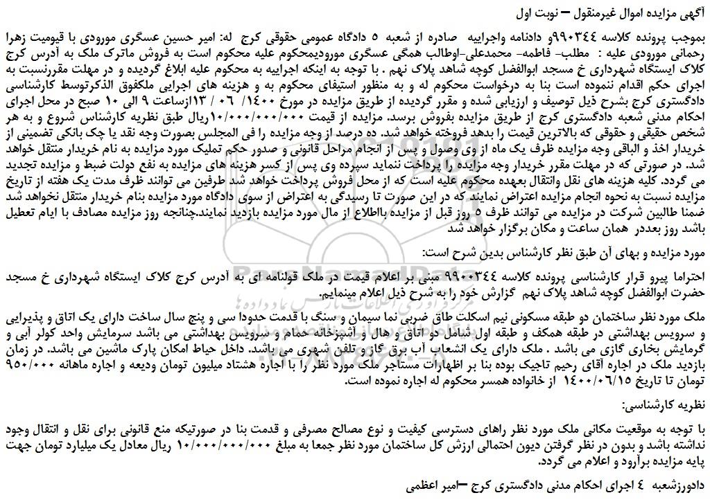 بموجب پرونده کلاسه 990344و دادنامه واجراییه  صادره از شعبه  5 دادگاه عمومی حقوقی کرج  له: امیر حسین عسگری مورودی با قیومیت زهرا رحمانی مورودی علیه :  مطلب- فاطمه- محمدعلی-اوطالب همگی عسگری مورودیمحکوم علیه محکوم است به فروش ماترک ملک به آدرس کرج کلاک ایستگاه شهرداری خ مسجد ابوالفضل کوچه شاهد پلاک نهم . با توجه به اینکه اجراییه به محکوم علیه ابلاغ گردیده و در مهلت مقررنسبت به اجرای حکم اقدام ننموده است بنا به درخواست محکوم له و به منظور استیفای محکوم به و هزینه های اجرایی ملکفوق الذکرتوسط کارشناسی دادگستری کرج بشرح ذیل توصیف و ارزیابی شده و مقرر گردیده از طریق مزایده در مورخ 1400/  06 / 13ازساعت 9 الی 10 صبح در محل اجرای احکام مدنی شعبه دادگستری کرج از طریق مزایده بفروش برسد. مزایده از قیمت 10/000/000/000ریال طبق نظریه کارشناس شروع و به هر شخص حقیقی و حقوقی که بالاترین قیمت را بدهد فروخته خواهد شد. ده درصد از وجه مزایده را فی المجلس بصورت وجه نقد یا چک بانکی تضمینی از خریدار اخذ و الباقی وجه مزایده ظرف یک ماه از وی وصول و پس از انجام مراحل قانونی و صدور حکم تملیک مورد مزایده به نام خریدار منتقل خواهد شد. در صورتی که در مهلت مقرر خریدار وجه مزایده را پرداخت ننماید سپرده وی پس از کسر هزینه های مزایده به نفع دولت ضبط و مزایده تجدید می گردد. کلیه هزینه های نقل وانتقال بعهده محکوم علیه است که از محل فروش پرداخت خواهد شد طرفین می توانند ظرف مدت یک هفته از تاریخ مزایده نسبت به نحوه انجام مزایده اعتراض نمایند که در این صورت تا رسیدگی به اعتراض از سوی دادگاه مورد مزایده بنام خریدار منتقل نخواهد شد ضمنا طالبین شرکت در مزایده می توانند ظرف 5 روز قبل از مزایده بااطلاع از مال مورد مزایده بازدید نمایند.چنانجه روز مزایده مصادف با ایام تعطیل باشد روز بعددر  همان ساعت و مکان برگزار خواهد شد