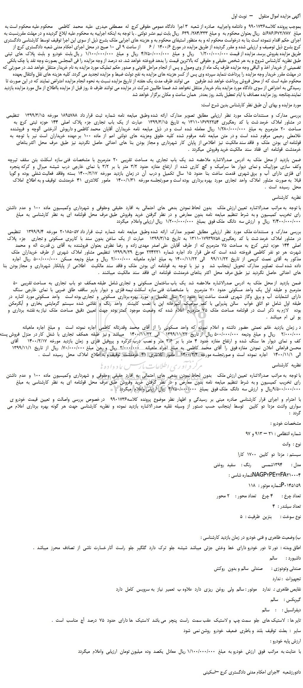 بموجب پرونده کلاسه9901736  و دادنامه واجراییه  صادره از شعبه  3 اجرا  دادگاه عمومی حقوقی کرج  له  مصطفی حیدری  علیه  محمد  کاظمی    محکوم علیه محکوم است به مبلغ  5/686/672/787  ریال بعنوان محکوم به  و مبلغ 284/333/ 639  ریال بابت نیم عشر دولتی . با توجه به اینکه اجراییه به محکوم علیه ابلاغ گردیده و در مهلت مقررنسبت به اجرای حکم اقدام ننموده است بنا به درخواست محکوم له و به منظور استیفای محکوم به و هزینه های اجرایی ملک بشرح ذیل از سوی این اجرا توقیف توسط کارشناسی دادگستری کرج بشرح ذیل توصیف و ارزیابی شده و مقرر گردیده از طریق مزایده در مورخ 1400/6  / 6      از ساعت 9 الی 10 صبح در محل اجرای احکام مدنی شعبه دادگستری کرج از طریق مزایده بفروش برسد. مزایده از قیمت 1/200/000/000    ریال  و  مبلغ  4/750/000/000  ریال  و  مبلغ  1/100/000/000  ر یال بابت  خودرو  و  بابت  پلاک  های  ثبتی  طبق نظریه کارشناس شروع و به هر شخص حقیقی و حقوقی که بالاترین قیمت را بدهد فروخته خواهد شد. ده درصد از وجه مزایده را فی المجلس بصورت وجه نقد یا چک بانکی تضمینی از خریدار اخذ و الباقی وجه مزایده ظرف یک ماه از وی وصول و پس از انجام مراحل قانونی و صدور حکم تملیک مورد مزایده به نام خریدار منتقل خواهد شد. در صورتی که در مهلت مقرر خریدار وجه مزایده را پرداخت ننماید سپرده وی پس از کسر هزینه های مزایده به نفع دولت ضبط و مزایده تجدید می گردد. کلیه هزینه های نقل وانتقال بعهده محکوم علیه است که از محل فروش پرداخت خواهد شد طرفین    می توانند ظرف مدت یک هفته از تاریخ مزایده نسبت به نحوه انجام مزایده اعتراض نمایند که در این صورت تا رسیدگی به اعتراض از سوی دادگاه مورد مزایده بنام خریدار منتقل نخواهد شد ضمنا طالبین شرکت در مزایده می توانند ظرف 5 روز قبل از مزایده بااطلاع از مال مورد مزایده بازدید نمایند.چنانجه روز مزایده مصادف با ایام تعطیل باشد روز بعددر  همان ساعت و مکان برگزار خواهد شد