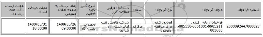 | 2000092447000023 | فراخوان ارزیابی کیفی 9905211-0051001-005110-001600 | ارزیابی کیفی برای مناقصه عمومی | مرکزی | شرکت پالایش نفت امام خمینی ره شازند | تجهیزات نفت و گاز | 1400/05/26 09:00:00 | 1400/05/31 18:00:00 |