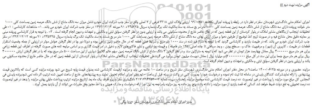 اجرای احکام مدنی دادگستری شهرستان سقز در نظر دارد در رابطه با پرونده اجرائی بکلاسه 9900751 ارزیابی پلاک ثبتی 3218 فرعی از 7 اصلی واقع در سقز جنب شرکت ایران خودرو شامل میزان سه دانگ مشاع از شش دانگ عرصه زمین بمساحت کلی 1000 متر خوانده پرونده دارای سه دانگ مشاع از شش دانگ عرصه زمین بمساحت کلی 1000 متر مر بع مستند به سند مالکیت تک برگ بشماره سریال 245225 د 91 مورخه 1392/12/12 در سقز جنب شرکت ایران خودرو می باشد . 1- مشاهدات کارشناسی : 1- طی تحقیقات اینجانب از بنگاهای مشاور املاک در بلوار کردستان از این قطعه زمین که در حال حاضر خارج از محدوده مسکونی می باشد و ارزیابی بدون در نظر گرفتن سوابق ثبتی و مالکیتی و تعهدات و دیون انجام گرفته است . 2- . با توجه به قرار کارشناسی پرونده مبنی بر معاینه دقیق محل متنازع فیه و در صورت لزوم اخذ توضیح از طرفین دعوا و میزان ارزش بهای سه دانگ مشاع از شش دانگ عرصه زمین بمساحت کلی 1000 متر مر بع مستند به سند مالکیت تک برگ بشماره سریال 245225 د 91 مورخه 1392/12/12 در سقز جنب شرکت ایران خودرو می باشد .که در طبیعت بازدید و کارشناسی گردید که با توجه به متراژ قید شده در سند 1000 متر مربع و شرایط فعلی قطعه که در حال حاضر زمین زراعی بوده و دورتا دور وبا در نظر گرفتن عوامل موثر در ارزیابی از جمله وضعیت استقرار قطعات در طبیعت ، کاربری آن (دیم ) و مرغوبیت خاک و ، مسطح بودن ، و بعد مسافتی تا جاده اصلی (135 متر فاصله ) و قیمت روز اراضی و سایر فاکتورهای لازم و دخیل در امر قیمت گذاری و بر اساس مبایعه نامه های صورت گرفته در اطراف این قطعه زراعی برای هر متر مربع 4000000 ریال معادل چهارصد هزار تومان در نظر می شود که با توجه به متراژاین سند و در نظر گرفتن 3 دانگ مشاع از شش دانگ عرصه زمین سهم خانم گلاویژ درباری از این مساحت 500 متر مربع بوده که با در نظر گرفتن ارزش 4000000 ریال برای هر متر مربع جمعا برای این سند در کل مبلغ 2000000000(دو میلیارد ریال ) معادل دویست میلیون تومان برآورد می گردد.طی تحقیقات اینجانب از بنگاهای مشاور املاک در بلوار کردستان از این قطعه زمین که در حال حاضر خارج از محدوده مسکونی می باشد و ارزیابی بدون در نظر گرفتن سوابق ثبتی و مالکیتی و تعهدات و دیون انجام گرفته است .