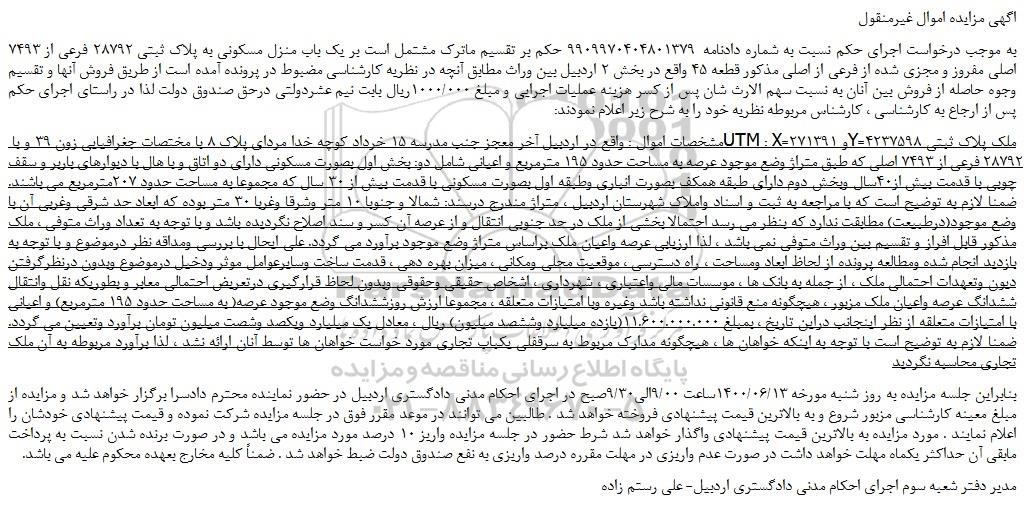 به موجب درخواست اجرای حکم نسبت به شماره دادنامه  9909970404801379 حکم بر تقسیم ماترک مشتمل است بر یک باب منزل مسکونی به پلاک ثبتی 28792 فرعی از 7493 اصلی مفروز و مجزی شده از فرعی از اصلی مذکور قطعه 45 واقع در بخش 2 اردبیل بین وراث مطابق آنچه در نظریه کارشناسی مضبوط در پرونده آمده است از طریق فروش آنها و تقسیم وجوه حاصله از فروش بین آنان به نسبت سهم الارث شان پس از کسر هزینه عملیات اجرایی و مبلغ 1000/000ریال بابت نیم عشردولتی درحق صندوق دولت لذا در راستای اجرای حکم پس از ارجاع به کارشناسی ، کارشناس مربوطه نظریه خود را به شرح زیر اعلام نمودند: