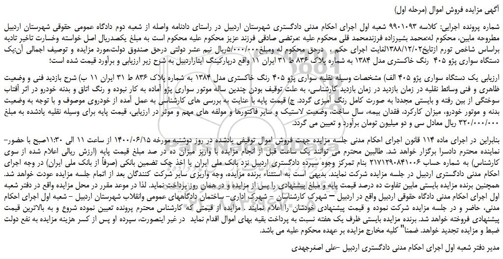 شماره پرونده اجرایی: کلاسه 9901093 شعبه اول اجرای احکام مدنی دادگستری شهرستان اردبیل در راستای دادنامه واصله از شعبه دوم دادگاه عمومی حقوقی شهرستان اردبیل مطروحه مابین، محکوم له:محمد بشیرزاده فرزندمحمد قلی محکوم علیه :مرتضی صادقی فرزند عزیز محکوم علیه محکوم است به مبلغ یکصدریال اصل خواسته وخسارت تاخیر تادیه براساس شاخص تورم ازتایخ1388/12/02لغایت اجرای حکم ،  درحق محکوم له ومبلغ5/000/000ریال نیم عشر دولتی درحق صندوق دولت،مورد مزایده و توصیف اجمالی آن:یک دستگاه سواری پژو 405  رنگ خاکستری مدل 1384 به شماره پلاک 836 ط 31 ایران 11 واقع درپارکینگ ایثاراردبیل به شرح زیر ارزیابی و برآورد قیمت شده است؛