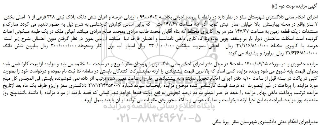 اجرای احکام مدنی دادگستری شهرستان سقز در نظر دارد در رابطه با پرونده اجرائی بکلاسه 9900402 ، ارزیابی عرصه و اعیان شش دانگ پلاک ثبتی 328 فرعی از 1 اصلی بخش 2 سقز واقع در محله بهارستان بالا خیابان عمار نبش کوچه آذر 3به مساحت 147/67 متر که براین اساس گزارش کارشناسی به شرح ذیل به حضور تقدیم می گردد. مدارک و مستندات : یک قطعه زمین به مساحت 147/67 متر مر بع کاربری مختلط که بنام آقایان محمد طالب مرادی ومحمد صالح مرادی میباشد اعیانی ملک در یک طبقه مسکونی احداث گردیده است اسکلت ساختمان دیوار بار بر وسقف چوبی بوده ونازک کاری داخلی نامناسب و اختمان فا قد نما میباشد ارزیابی بدون در نظر گرفتن دیون احتمالی بشرح زیر است عرصه با کاربری مختلط 21/116/810/000 ریال اعیانی بصورت میانگین 230/000/000 ریال امتیاز آب برق گاز ومحوطه 300/000/000 ریال بنابرین شش دانگ 21/646/810/000 ریال برآورد و پیشنهاد می گردد.