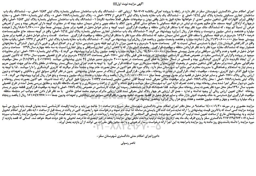 اجرای احکام مدنی دادگستری شهرستان سقز در نظر دارد در رابطه با پرونده اجرائی بکلاسه 980707 ارزیابی الف - ششدانگ یک باب ساختمان مسکونی بشماره پلاک ثبتی 1483-اصلی ب- ششدانگ یک باب ساختمان تجاری مسکونی بشماره پلاک ثبتی 1464-اصلی ج - ششدانگ یک باب مغازه بشماره پلاک ثبتی 31 فرعی از 1337-اصلی د- پلاک ثبتی بشماره 1789-اصلی ه- پلاک ثبتی بشماره 1750-اصلی و- مغازه اوقافی (برابر اظهارات آقای شاهین سلیمی احدی از خواهانها مغازه فوق به دلیل وقفی بودن و موضوعات حقوقی فعلاً محاسبه نگردد) 1- ششدانگ یک باب ساختمان مسکونی بشماره پلاک ثبتی 1483-اصلی: واقع درچهارراه آزادگان کوچه مسجد حاج حکیم بصورت دو نبش در دو طبقه مسکونی با مصالح سنتی کلنگی بدون کلاف با سقف چوبی و نمای سیمان سفید بوده که در مجاورت کوچه دارای تعریض بوده و پس از تعریض عرض آن نسبتاً کم بوده ، که ششدانگ ملک مورد نظر بوده که با مدنظر قراردادن منطقه و موقعیت قرارگیری شیب کوچه و سایر عوامل دخیل در قضیه برابر جدول پیوستی جمعاً مبلغ 18.806.250.000ریال ( هیجده میلیارد و هشتصد و شش میلیون و دویست و پنجاه هزار ریال ) برآورد وپیشنهاد می گردد. 2-ششدانگ یک باب ساختمان تجاری مسکونی بشماره پلاک ثبتی 1464-اصلی: واقع در کوچه مسجد حاج حکیم بمساحت عرصه 159.30 مترمربع در دو طبقه مسکونی با سقف طاق ضربی نمای سیمان سفید که ششدانگ ملک مورد نظر با مدنظر قراردادن منطقه و موقعیت قرارگیری مساحت قدمت و سایر عوامل دخیل در قضیه برابر جدول پیوستی جمعاً مبلغ 16.760.500.000ریال ( شانزده میلیارد و هفتصد وشصت میلیون و پانصد هزار ریال)برآورد وپیشنهاد می گردد . 3- ششدانگ یک باب مغازه بشماره پلاک ثبتی 31 فرعی از 1337-اصلی: یکباب مغازه واقع در گذرکفش فروشان بازار شیخ با دسترسی شمالی نسبت به گذر بمساحت حدود 9 مترمربع و به همین میزان دارای نیم طبقه بدون دسترسی سازه ای و در اضلاع شرقی و غربی دارای دیوار اشتراکی با مغازههای همجوار بوده که ششدانگ مغازه مورد نظر با مد نظر قراردادن منطقه و موقعیت قرارگیری وضعیت کنونی بازار که با کاهش ارزش تجاری(سرقفلی و رونق تجاری) نسبت به سه ماهه چهارم سال 1399 مساحت و سایر عوامل دخیل در قضیه و عدم واگذاری سرقفلی برابر جدول پیوستی جمعاً مبلغ 14.900.000.000 ریال ( چهارده میلیارد و نهصد میلیون ریال) برآورد وپیشنهاد می گردد 4- پلااک ثبتی بشماره 1750-اصلی : برابر محتویات موجود در پرونده وگزارش کارشناسی منفرد در خصوص همکاری کارشناس شهرسازی در پرونده های قبلی پلاک ثبتی 1750-اصلی بمساحت 22462.52 مترمربع برابر طرح تفصیلی مصوب سال 1390 که تاکنون تغییری در آن ایجاد نگردیده دارای کاربری گردشگری بوده و قسمتی در شمال متمایل به ضلع غربی بمساحت در حدود 2000 مترمربع مسیر خیابان 24 متری پیشنهادی میباشد (4011755 و 614976) در محل موقعیت جغرافیایی معرفی شده برابر معرفی آقای شاهین سلیمی در وضعیت کنونی بعنوان باغچه سبزیکاری مورد استفاده قرار می گیرد با توجه به عدم اجرای دیوار سنگی بستر رودخانه در مقطع پلاک مذکور جهت تعیین حریم و بستر نیاز به استعلام و هماهنگی با مدیریت محترم امور منابع آب شهرستان سقز دارد . پلاک مورد نظر هم اکنون در محل بصورت خام بوده و مجدداً متذکر میگردد که کاربری گردشگری را دارا میباشد . لذا با توجه به موارد فوق الذکر ، نوع کاربری ، وسعت ، موقعیت ، ابعاد ، قرارگیری در مجاورت رودخانه ، خام بودن ، قرارگیری قسمتی از پلاک در مسیر خیابان پیشنهادی بدون در نظر گرفتن سوابق ثبتی و مالکیتی و تعهدات و دیون ارزش ریالی پلاک 1750-اصلی و سایر عوامل دخیل در قضیه برابر جدول پیوستی جمعاً مبلغ 101/081/025/000ریال ( یکصد و یک میلیارد و هشتاد و یک میلیون و بیست و پنج هزار ریال )برآورد وپیشنهاد می گردد . 5-- پلاک ثبتی بشماره 1789-اصلی : محل پلاک 1789-اصلی برابر موقعیت مکانی معرفی شده توسط آقای شاهین سلیمی (بمساحت 10737 مترمربع) طبق کروکی ارائه شده نامبرده هم اکنون بصورت بستر رودخانه و مابین دو دیوار سنگی اجرا شده بستر رودخانه بوده و تحت تصرف اداره امور آب شهرستا