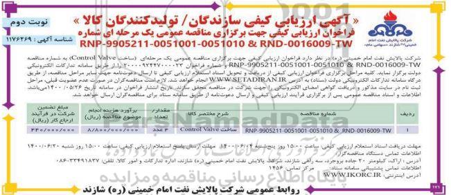 شرکت پالایش نفت امام خمینی (ره) در نظر دارد فراخوان ارزیابی کیفی جهت برگزاری مناقصه عمومی یک مرحله ای ساخت control valve به شماره مناقصه tw-0016009-rnd & 0051010-0051001-9905211-pnt  و شماره فراخوان 2000092447000023 را از طریق سامانه تدارکات الکترونیکی دولت برگزار نماید کلیه مراحل برگزاری فراخوان ارزیابی کیفی از دریافت و تحویل اسناد استعلام ارزیابی کیفی تا ارسال دعوت نامه جهت سایر مراحل مناقصه از طریق درگاه  سامانه تدارکات الکترونیکی دولت ستاد به آدرس ستاد ایران انجام خواهد شد لازم است مناقصه گران در صورت عدم عضویت قبلی مراحل ثبت نام در سایت مذکور و دریافت گواهی امضای الکترونیکی ار جهت شرکت در مناقصه محقق سازند تاریخ انتشار فراخوان در سامانه تاریخ 1400.5.26 می باشد اطلاعات و اسناد مناقصه عمومی پس از برگزاری فرایند ارزیابی کیفی و ارسال دعوتنامه از طریق سامانه ستاد به مناقصه گران ارسال خواهد شد