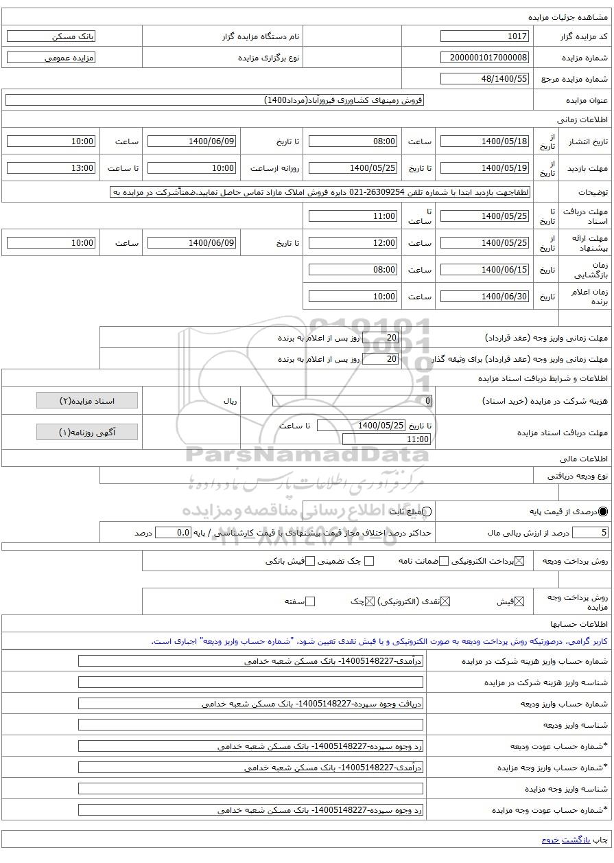 شماره حساب واریز وجه مزایده | درآمدی-14005148227- بانک مسکن شعبه خدامی |