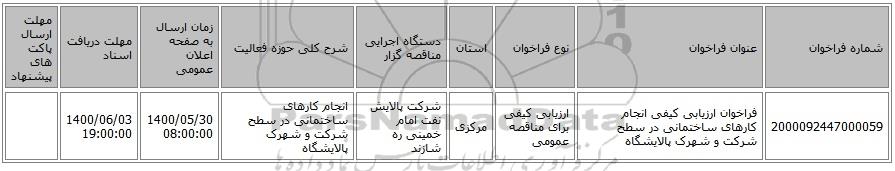 | 2000092447000059 | فراخوان ارزیابی کیفی انجام کارهای ساختمانی در سطح شرکت و شهرک پالایشگاه | ارزیابی کیفی برای مناقصه عمومی | مرکزی | شرکت پالایش نفت امام خمینی ره شازند | انجام کارهای ساختمانی در سطح شرکت و شهرک پالایشگاه | 1400/05/30 08:00:00 | 1400/06/03 19:00:00 |