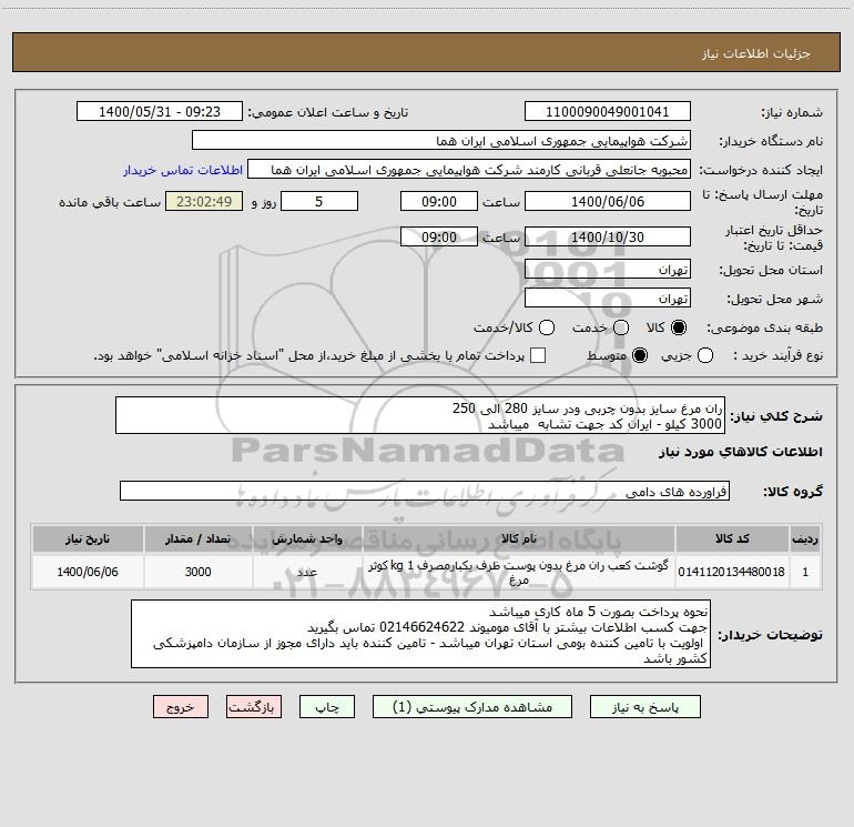 شرح کلی نیاز: ران مرغ سایز بدون چربی ودر سایز 280 الی 250
