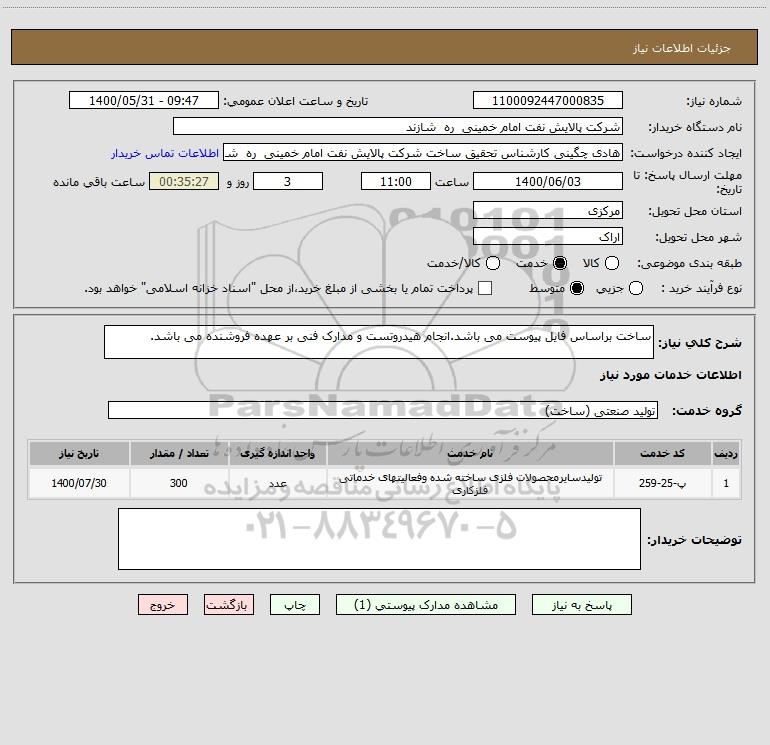 شرح کلی نیاز: ساخت براساس فایل پیوست می باشد.انجام هیدروتست و مدارک فنی بر عهده فروشنده می باشد.