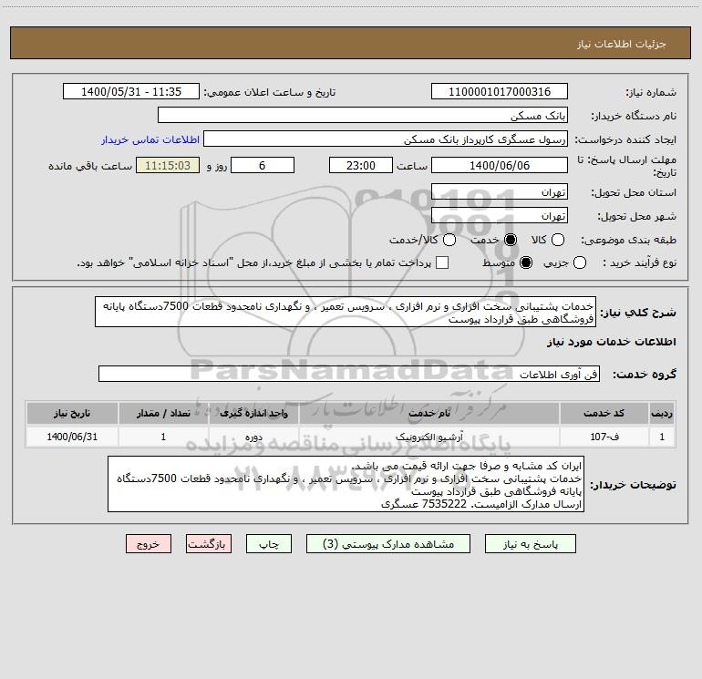 شرح کلی نیاز: خدمات پشتیبانی سخت افزاری و نرم افزاری ، سرویس تعمیر ، و نگهداری نامحدود قطعات 7500دستگاه پایانه فروشگاهی طبق قرارداد پیوست