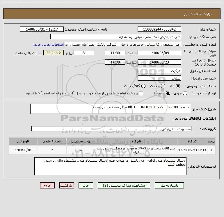 شرح کلی نیاز: 2 عدد PROBE مارک RB TECHNOLOGIES طبق مشخصات پیوست.