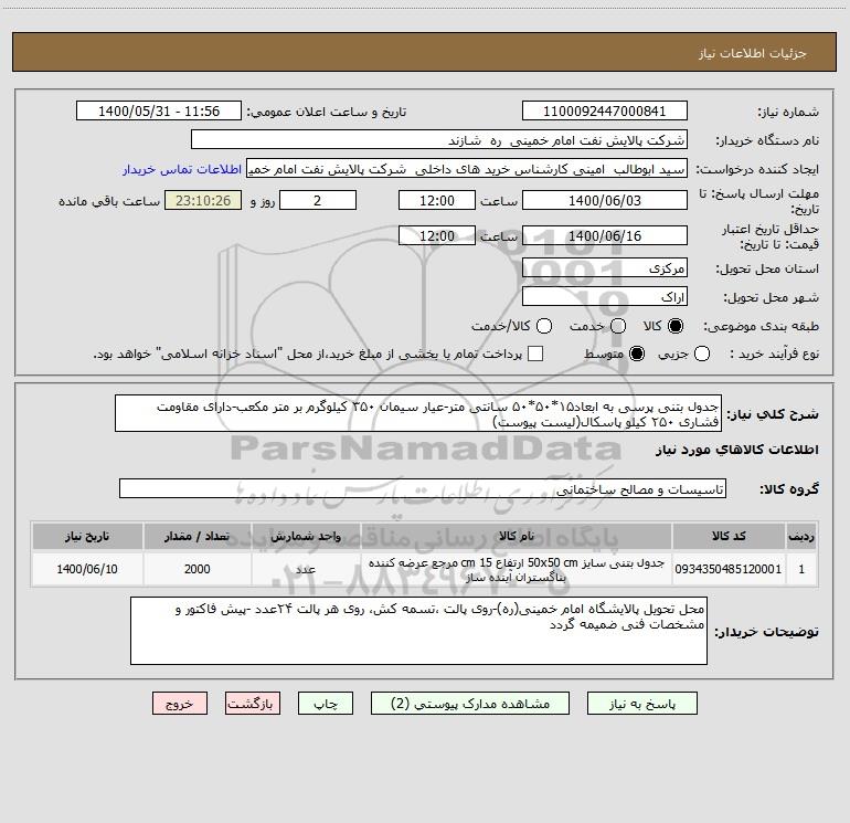 شرح کلی نیاز: جدول بتنی پرسی به ابعاد۱۵*۵۰*۵۰ سانتی متر-عیار سیمان ۳۵۰ کیلوگرم بر متر مکعب-دارای مقاومت فشاری ۲۵۰ کیلو پاسکال(لیست پیوست)