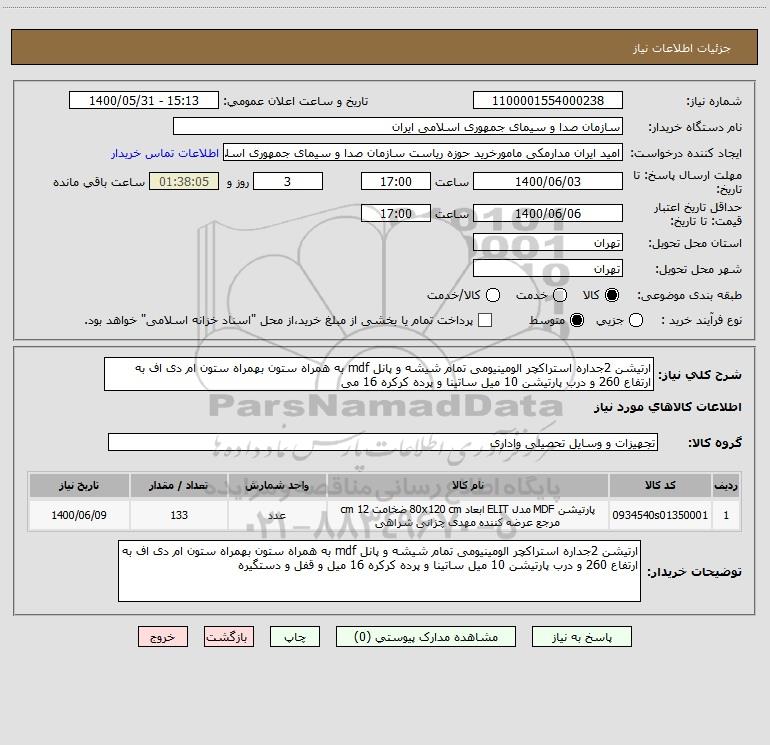 شرح کلی نیاز: ارتیشن 2جداره استراکچر الومینیومی تمام شیشه و پانل mdf به همراه ستون بهمراه ستون ام دی اف به ارتفاع 260 و درب پارتیشن 10 میل ساتینا و پرده کرکره 16 می