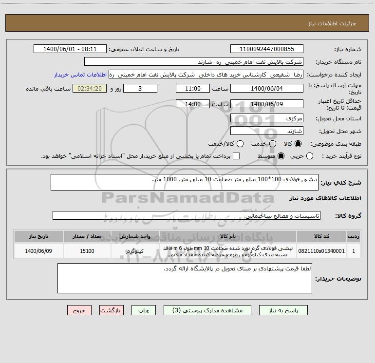 شرح کلی نیاز: نبشی فولادی 100*100 میلی متر ضخامت 10 میلی متر، 1000 متر.