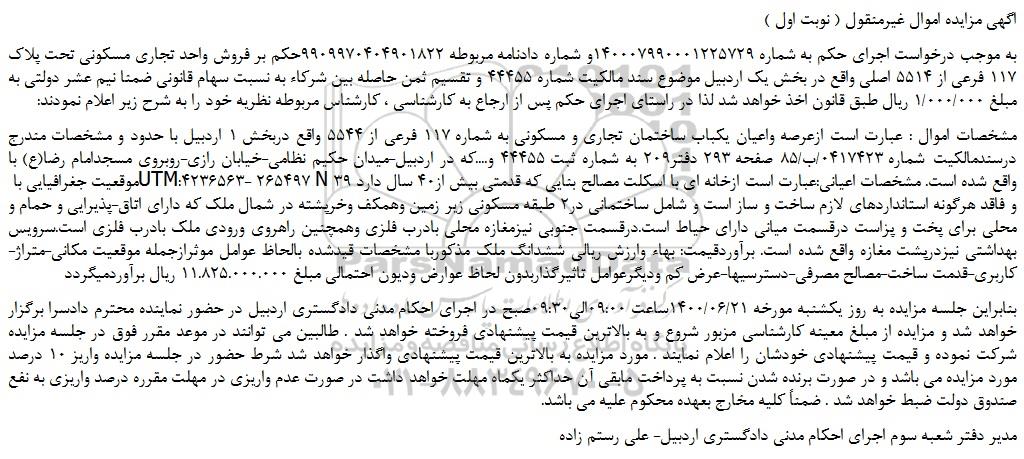 به موجب درخواست اجرای حکم به شماره 140007990001225729و شماره دادنامه مربوطه 9909970404901822حکم بر فروش واحد تجاری مسکونی تحت پلاک 117 فرعی از 5514 اصلی واقع در بخش یک اردبیل موضوع سند مالکیت شماره 44455 و تقسیم ثمن حاصله بین شرکاء به نسبت سهام قانونی ضمنا نیم عشر دولتی به مبلغ 1/000/000 ریال طبق قانون اخذ خواهد شد لذا در راستای اجرای حکم پس از ارجاع به کارشناسی ، کارشناس مربوطه نظریه خود را به شرح زیر اعلام نمودند: