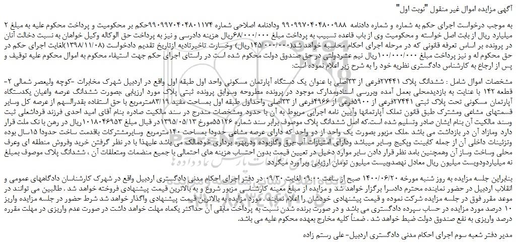 بنابراین جلسه مزایده به روز شنبه مورخه 1400/06/20 صبح از ساعت 09:00 لغایت 09/30 در دفتر اجرای احکام مدنی دادگستری اردبیل واقع در شهرک کارشناسان دادگاههای عمومی و انقلاب اردبیل در حضور نماینده محترم دادسرا برگزار خواهد شد و مزایده از مبلغ معینه کارشناسی مزبور شروع و به بالاترین قیمت پیشنهادی فروخته خواهد شد . طالبین می توانند در موعد مقرر فوق در جلسه مزایده شرکت نموده و قیمت پیشنهادی خودشان را اعلام نمایند . مورد مزایده به بالاترین قیمت پیشنهادی واگذار خواهد شد شرط حضور در جلسه مزایده واریز 10 درصد مورد مزایده در حساب سپرده دادگستری می باشد و در صورت برنده شدن نسبت به پرداخت مابقی آن حداکثر یکماه مهلت خواهد داشت در صورت عدم واریزی در مهلت مقرره درصد واریزی به نفع صندوق دولت ضبط خواهد شد . ضمناً کلیه مخارج بعهده محکوم علیه می باشد.