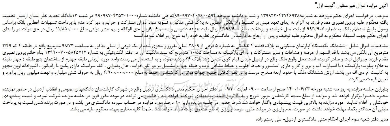 بموجب درخواست اجرای حکم مربوطه به شماره1399220427469388 و شماره دادنامه مربوطه 9909970407600594که طی دادنامه شماره9909970425301000 در شعبه 13دادگاه تجدید نظر استان اردبیل قطعیت یافته محکوم علیه پروین نصیری مقدم فرزند به االزام به ایفای تعهد مبنی بر تقسیط وام بانکی اعطایی به پلاک ثبتی مذکور و تسویه سود دوران مشارکت و جرایم و دیر کرد عدم بازپرداخت تسهیلات اعطایی بانک براساس وصول پاسخ استعلام بانک به شماره 7-99/2/9 از بابت اصل خواسته و پرداخت مبلغ 1/298/600 ریال بابت هزینه دادرسی و 6/060/000ریال حق الوکاله و نیم عشر دولتی مبلغ 12/850/000 ریال در حق دولت در راستای اجرای حکم جهت استیفاء محکوم به اموال محکوم علیه توقیف و پس از ارجاع به کارشناس دادگستری نظریه خود را به شرح زیر اعلام نموده است: