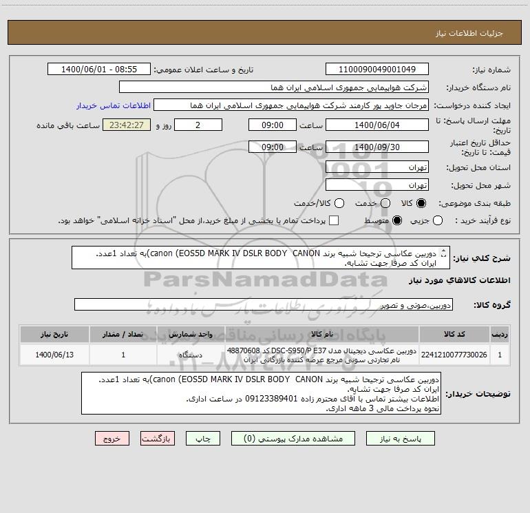 شرح کلی نیاز: دوربین عکاسی ترجیحا شبیه برند canon (EOS5D MARK IV DSLR BODY CANON)به تعداد 1عدد. ایران کد صرفا جهت تشابه. اطلاعات بیشتر توضیحات مطالعه شود.