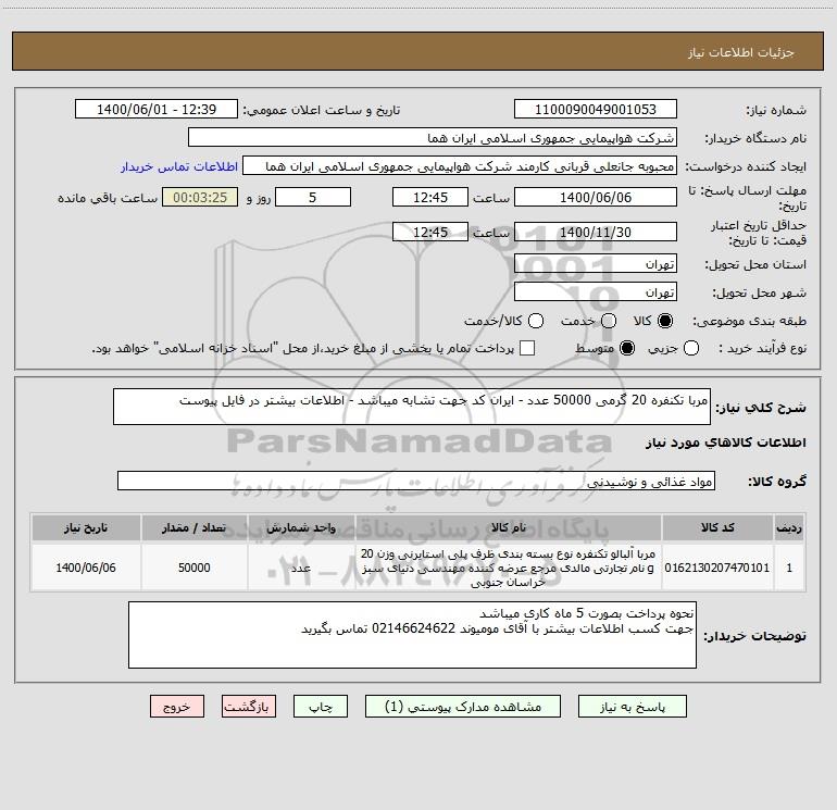 شرح کلی نیاز: مربا تکنفره 20 گرمی 50000 عدد - ایران کد جهت تشابه میباشد - اطلاعات بیشتر در فایل پیوست