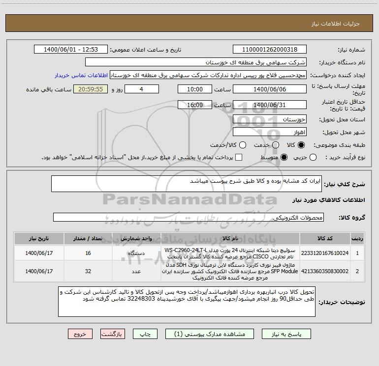 شرح کلی نیاز: ایران کد مشابه بوده و کالا طبق شرح پیوست میباشد