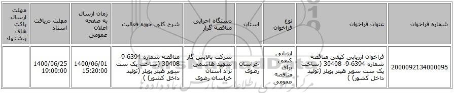 | 2000092134000095 | فراخوان ارزیابی کیفی مناقصه شماره 6394-9- 30408 (ساخت یک ست سوپر هیتر بویلر (تولید داخل کشور) ) | ارزیابی کیفی برای مناقصه عمومی | خراسان رضوی | شرکت پالایش گاز شهید هاشمی نژاد استان خراسان رضوی | مناقصه شماره 6394-9- 30408 (ساخت یک ست سوپر هیتر بویلر (تولید داخل کشور) ) | 1400/06/01 15:20:00 | 1400/06/25 19:00:00 |