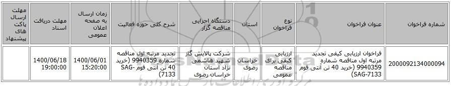 2000092134000094فراخوان ارزیابی کیفی تجدید مرتبه اول مناقصه شماره 9940359 (خرید 40 تن آنتی فوم SAG-7133)ارزیابی کیفی برای مناقصه عمومیخراسان رضویشرکت پالایش گاز شهید هاشمی نژاد استان خراسان رضویتجدید مرتبه اول مناقصه شماره 9940359 (خرید 40 تن آنتی فوم SAG-7133) 1400/06/01 15:20:001400/06/18 19:00:00