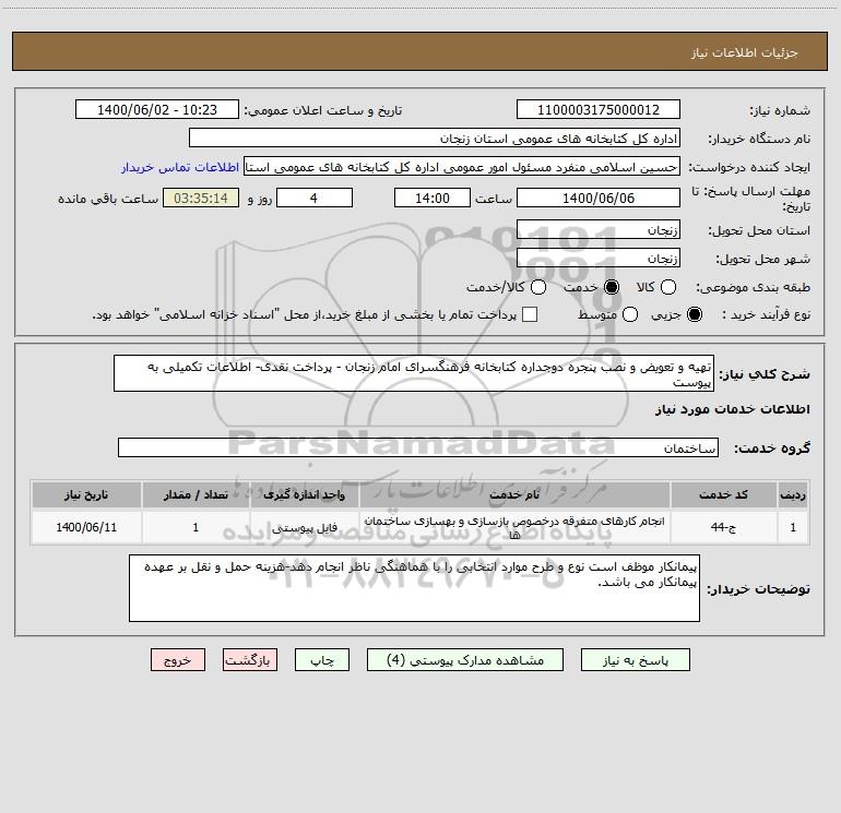 شرح کلی نیاز: تهیه و تعویض و نصب پنجره دوجداره کتابخانه فرهنگسرای امام زنجان - پرداخت نقدی- اطلاعات تکمیلی به پیوست