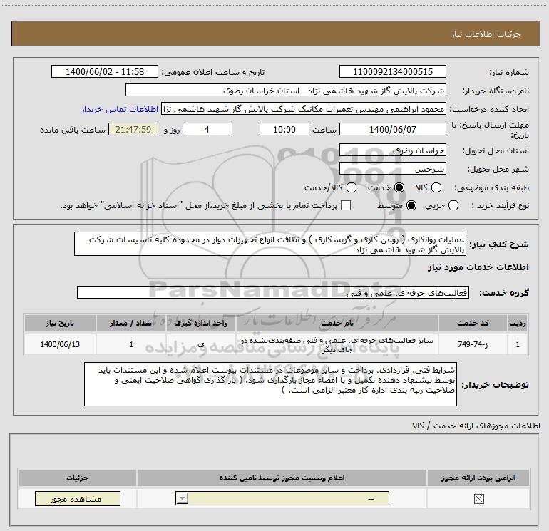 شرح کلی نیاز: عملیات روانکاری ( روغن کاری و گریسکاری ) و نظافت انواع تجهیزات دوار در محدوده کلیه تاسیسات شرکت پالایش گاز شهید هاشمی نژاد
