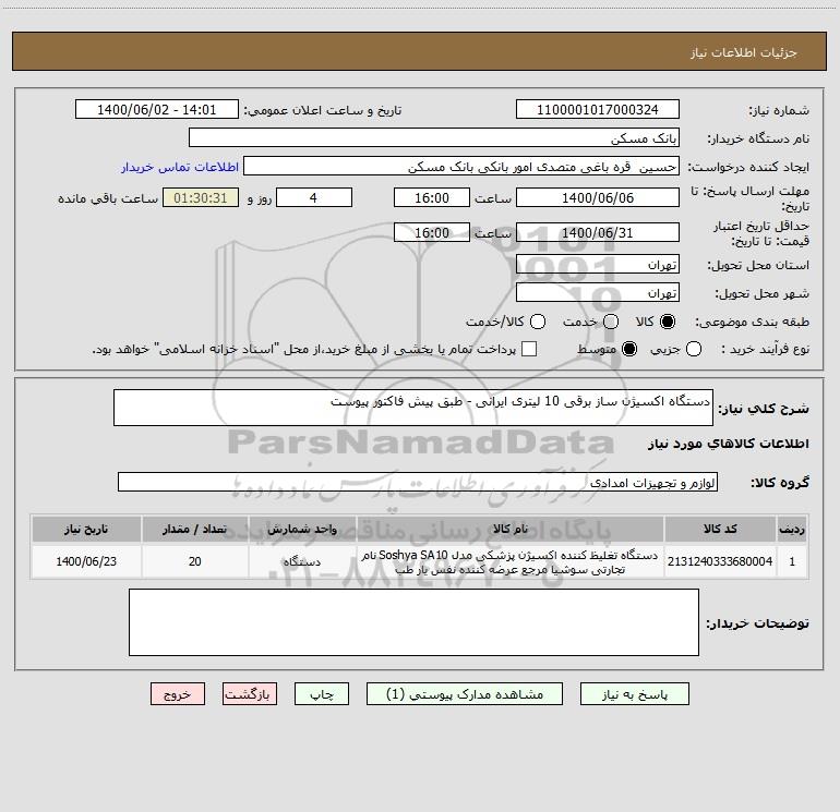 شرح کلی نیاز: دستگاه اکسیژن ساز برقی 10 لیتری ایرانی - طبق پیش فاکتور پیوست