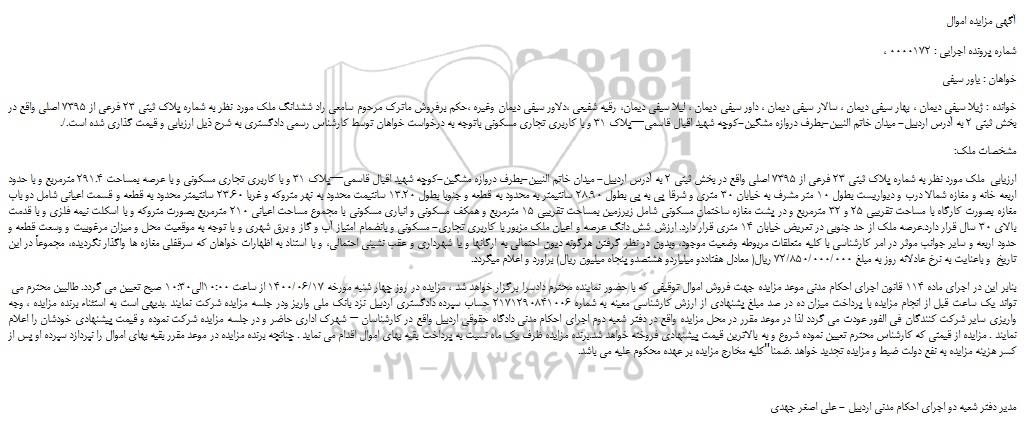 خوانده : ژیلا سیفی دیمان ، بهار سیفی دیمان ، سالار سیفی دیمان ، داور سیفی دیمان ، لیلا سیفی دیمان، رقیه شفیعی ،دلاور سیفی دیمان وغیره ،حکم برفروش ماترک مرحوم سامعی راد ششدانگ ملک مورد نظر به شماره پلاک ثبتی 23 فرعی از 7395 اصلی واقع در بخش ثبتی 2 به آدرس اردبیل- میدان خاتم النبین-بطرف دروازه مشگین-کوچه شهید اقبال قاسمی—پلاک 31 و با کاربری تجاری مسکونی باتوجه به درخواست خواهان توسط کارشناس رسمی دادگستری به شرح ذیل ارزیابی و قیمت گذاری شده است./.
