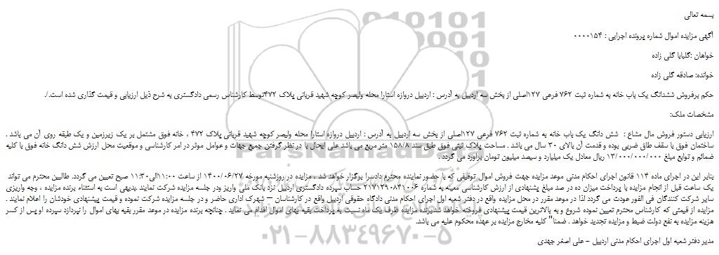 آگهی مزایده اموال شماره پرونده اجرایی : 0000154