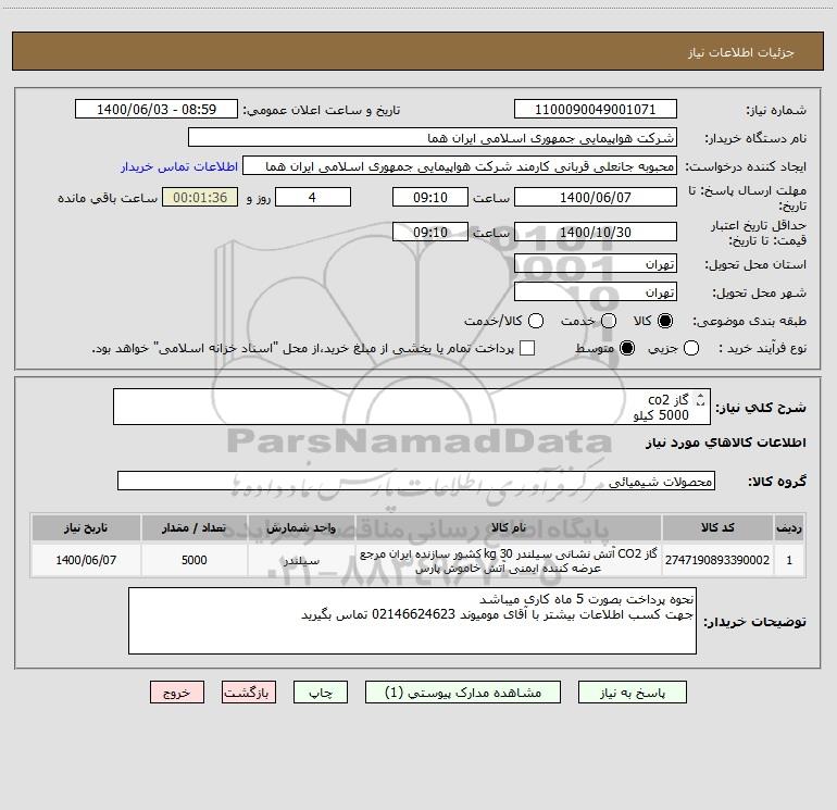 | 1 | 2747190893390002 | گاز CO2 آتش نشانی سیلندر 30 kg کشور سازنده ایران مرجع عرضه کننده ایمنی آتش خاموش پارس | سیلندر | 5000 | 1400/06/07 |