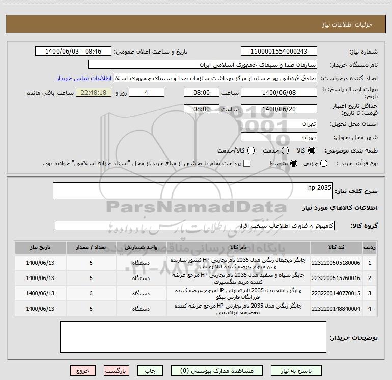 | 3 | 2232200140770015 | چاپگر رایانه مدل 2035 نام تجارتی HP مرجع عرضه کننده فرزانگان فارس نیکو | دستگاه | 6 | 1400/06/13 |