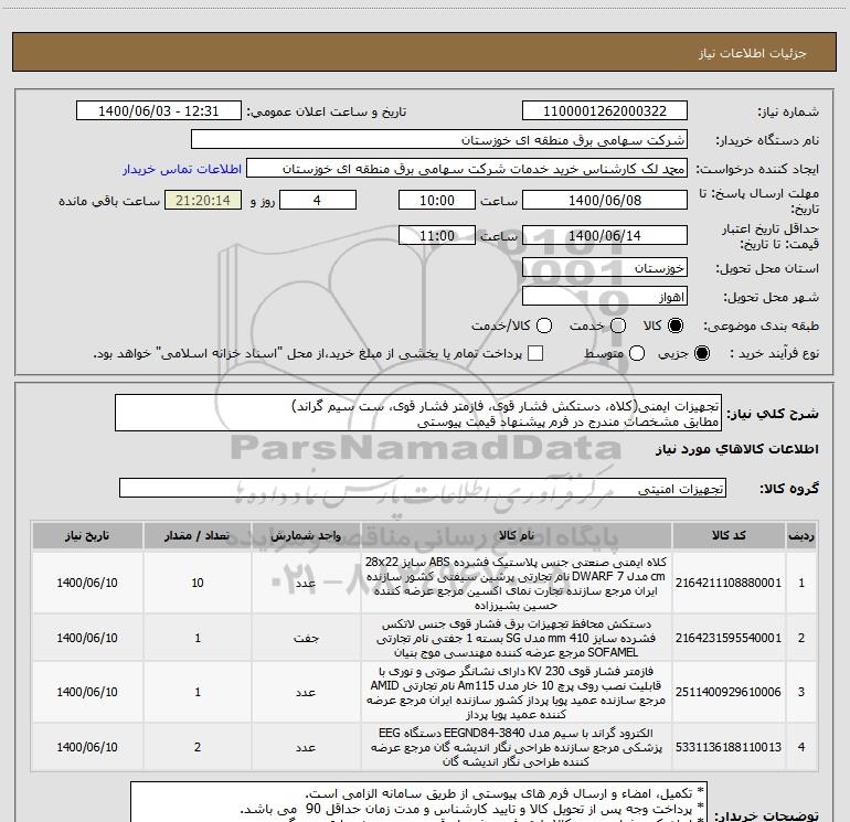 شرح کلی نیاز: تجهیزات ایمنی(کلاه، دستکش فشار قوی، فازمتر فشار قوی، ست سیم گراند)