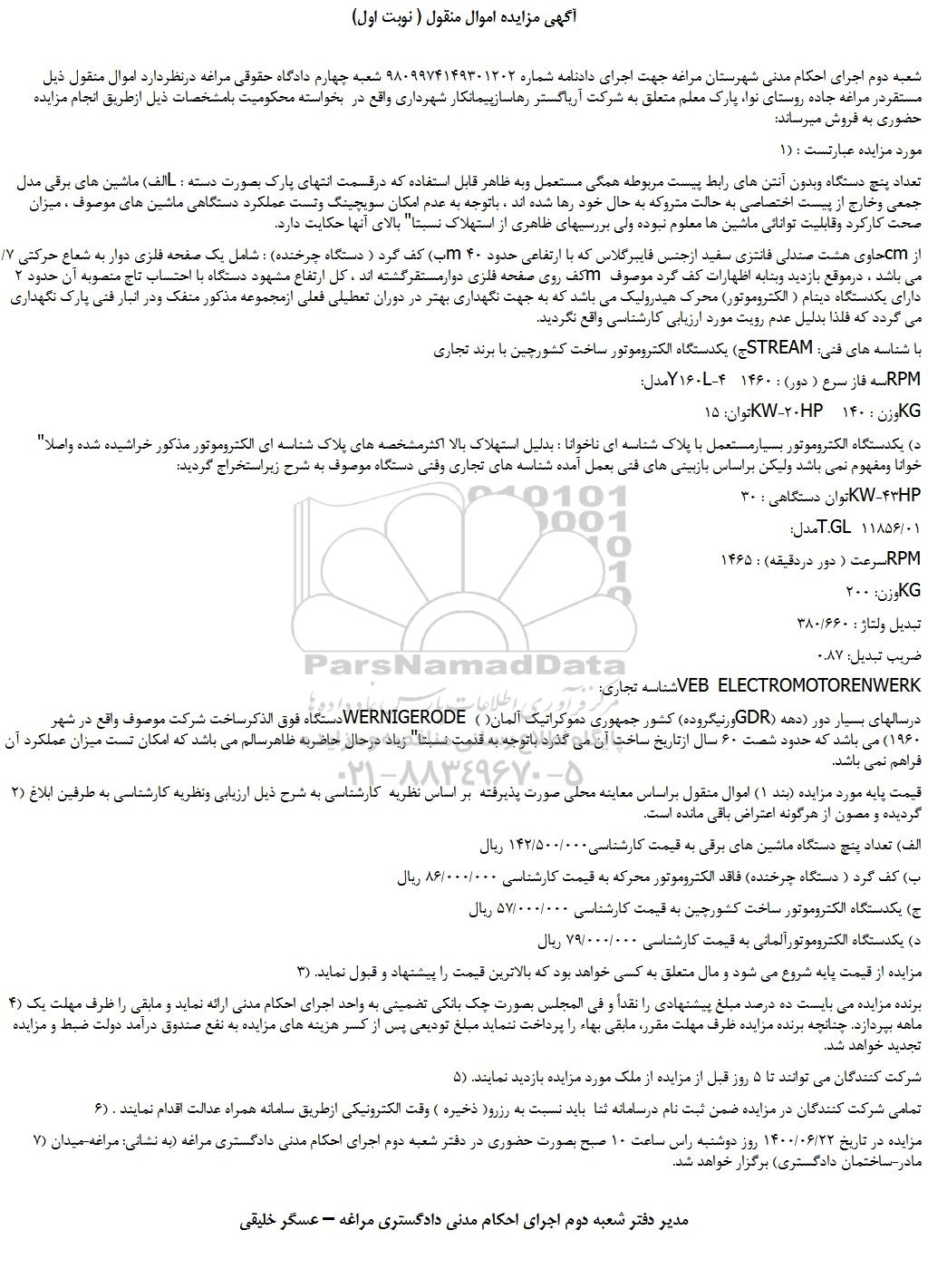شعبه دوم اجرای احکام مدنی شهرستان مراغه جهت اجرای دادنامه شماره 9809974149301202 شعبه چهارم دادگاه حقوقی مراغه درنظردارد اموال منقول ذیل مستقردر مراغه جاده روستای نوا، پارک معلم متعلق به شرکت آریاگستر رهاسازپیمانکار شهرداری واقع در بخواسته محکومیت بامشخصات ذیل ازطریق انجام مزایده حضوری به فروش میرساند:
