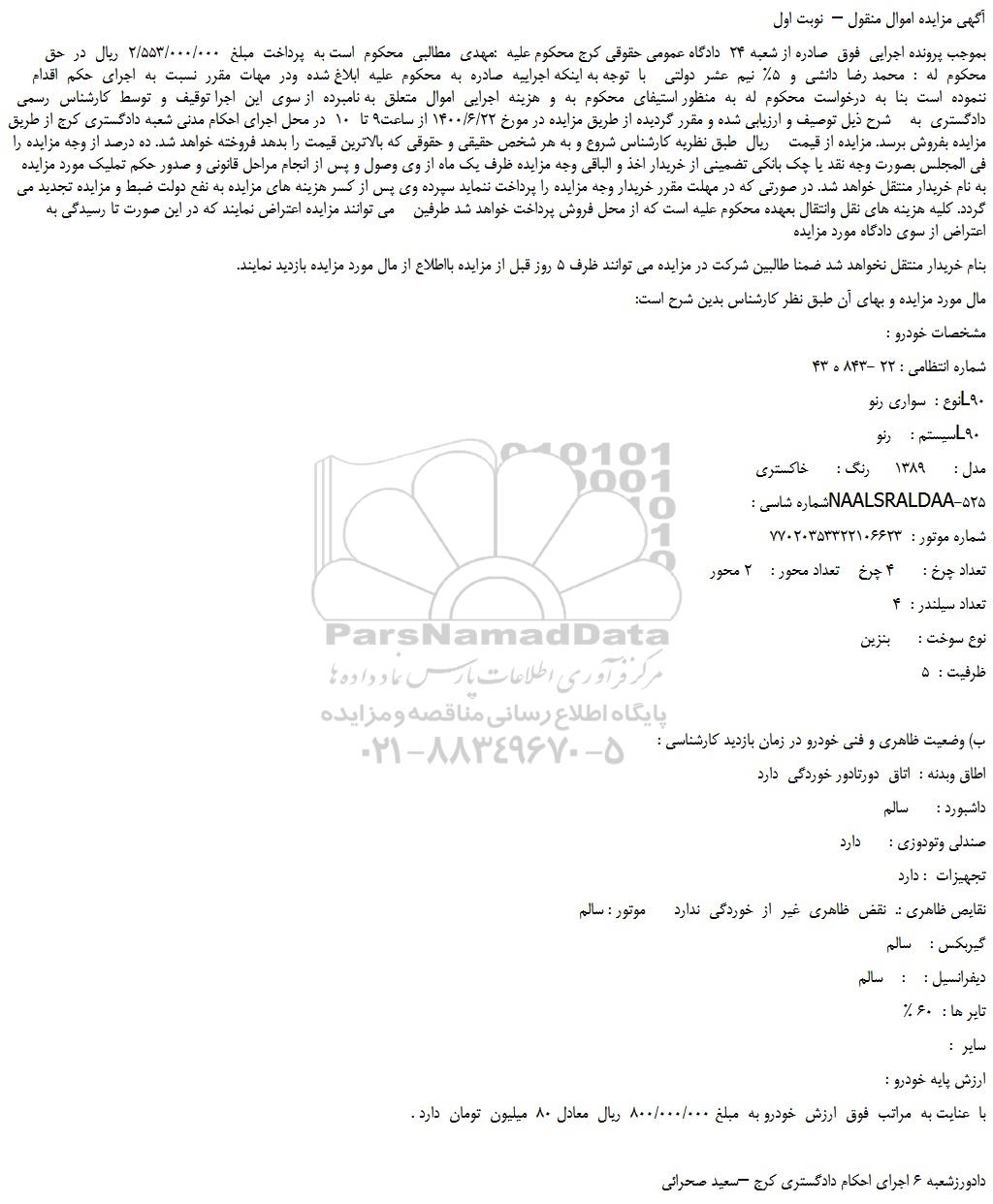 بموجب پرونده اجرایی  فوق  صادره از شعبه 24  دادگاه عمومی حقوقی کرج محکوم علیه  :مهدی  مطالبی  محکوم  است به  پرداخت  مبلغ  2/553/000/000  ریال  در  حق  محکوم  له  :  محمد رضا  دانشی  و  5%  نیم  عشر  دولتی    با  توجه به اینکه اجراییه  صادره  به  محکوم  علیه  ابلاغ شده  ودر  مهات  مقرر  نسبت  به  اجرای  حکم  اقدام  ننموده  است  بنا  به  درخواست  محکوم  له  به  منظور استیفای  محکوم  به  و  هزینه  اجرایی  اموال  متعلق  به نامبرده  از سوی  این  اجرا توقیف  و  توسط  کارشناس  رسمی  دادگستری  به    شرح ذیل توصیف و ارزیابی شده و مقرر گردیده از طریق مزایده در مورخ 1400/6/22 از ساعت9 تا  10  در محل اجرای احکام مدنی شعبه دادگستری کرج از طریق مزایده بفروش برسد. مزایده از قیمت    ریال  طبق نظریه کارشناس شروع و به هر شخص حقیقی و حقوقی که بالاترین قیمت را بدهد فروخته خواهد شد. ده درصد از وجه مزایده را فی المجلس بصورت وجه نقد یا چک بانکی تضمینی از خریدار اخذ و الباقی وجه مزایده ظرف یک ماه از وی وصول و پس از انجام مراحل قانونی و صدور حکم تملیک مورد مزایده به نام خریدار منتقل خواهد شد. در صورتی که در مهلت مقرر خریدار وجه مزایده را پرداخت ننماید سپرده وی پس از کسر هزینه های مزایده به نفع دولت ضبط و مزایده تجدید می گردد. کلیه هزینه های نقل وانتقال بعهده محکوم علیه است که از محل فروش پرداخت خواهد شد طرفین    می توانند مزایده اعتراض نمایند که در این صورت تا رسیدگی به اعتراض از سوی دادگاه مورد مزایده