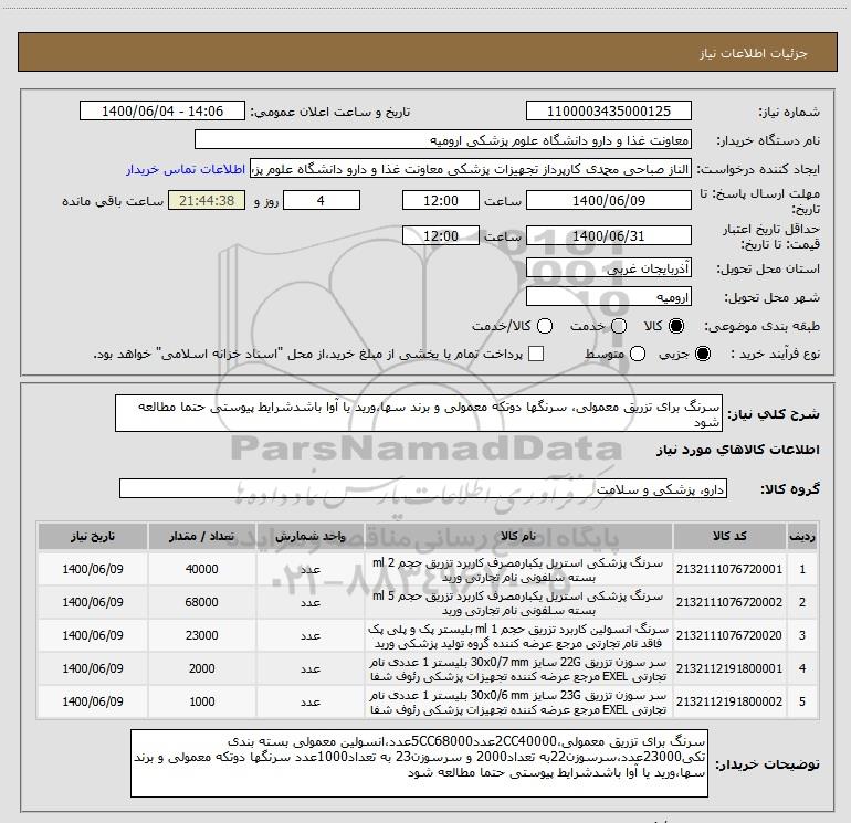شرح کلی نیاز: سرنگ برای تزریق معمولی، سرنگها دوتکه معمولی و برند سها،ورید یا آوا باشدشرایط پیوستی حتما مطالعه شود