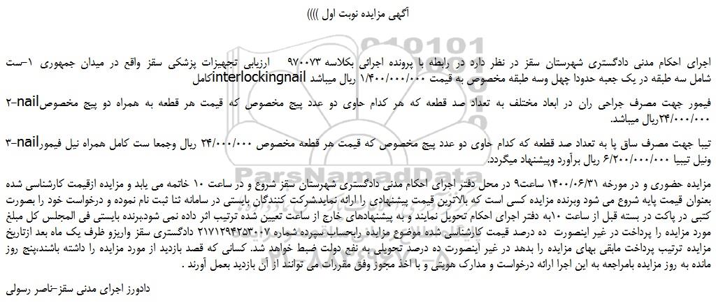 اجرای احکام مدنی دادگستری شهرستان سقز در نظر دارد در رابطه با پرونده اجرائی بکلاسه 970073 ارزیابی تجهیزات پزشکی سقز واقع در میدان جمهوری 1-ست کاملinterlockingnail شامل سه طبقه در یک جعبه حدودا چهل وسه طبقه مخصوص به قیمت 1/400/000/000 ریال میباشد