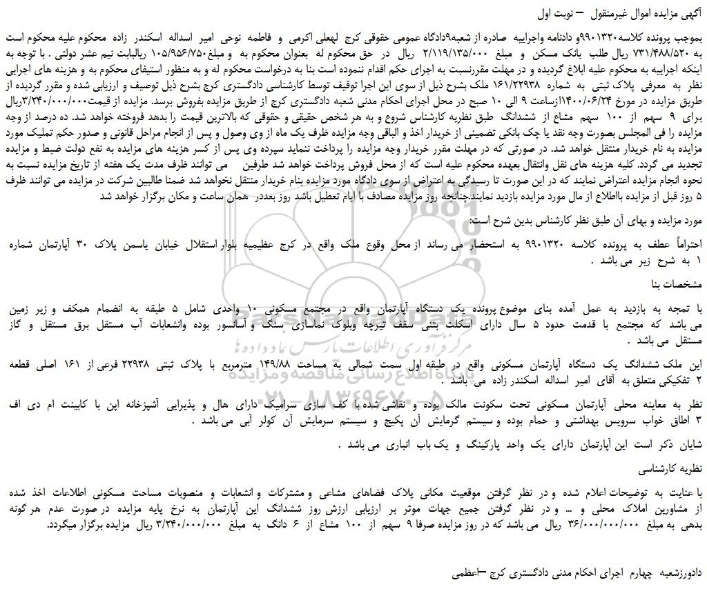 بموجب پرونده کلاسه9901320و دادنامه واجراییه  صادره از شعبه9دادگاه عمومی حقوقی کرج  لهعلی اکرمی  و  فاطمه  نوحی  امیر  اسداله  اسکندر  زاده  محکوم علیه محکوم است به 731/488/520 ریال طلب  بانک مسکن  و  مبلغ  2/119/135/000  ریال  در  حق محکوم له  بعنوان محکوم به  و مبلغ105/956/750 ریالبابت نیم عشر دولتی . با توجه به اینکه اجراییه به محکوم علیه ابلاغ گردیده و در مهلت مقررنسبت به اجرای حکم اقدام ننموده است بنا به درخواست محکوم له و به منظور استیفای محکوم به و هزینه های اجرایی نظر  به  معرفی  پلاک ثبتی  به  شماره  161/22938 ملک بشرح ذیل از سوی این اجرا توقیف توسط کارشناسی دادگستری کرج بشرح ذیل توصیف و ارزیابی شده و مقرر گردیده از طریق مزایده در مورخ 1400/06/24ازساعت 9 الی 10 صبح در محل اجرای احکام مدنی شعبه دادگستری کرج از طریق مزایده بفروش برسد. مزایده از قیمت3/240/000/000ریال برای  9  سهم  از  100  سهم  مشاع از  ششدانگ  طبق نظریه کارشناس شروع و به هر شخص حقیقی و حقوقی که بالاترین قیمت را بدهد فروخته خواهد شد. ده درصد از وجه مزایده را فی المجلس بصورت وجه نقد یا چک بانکی تضمینی از خریدار اخذ و الباقی وجه مزایده ظرف یک ماه از وی وصول و پس از انجام مراحل قانونی و صدور حکم تملیک مورد مزایده به نام خریدار منتقل خواهد شد. در صورتی که در مهلت مقرر خریدار وجه مزایده را پرداخت ننماید سپرده وی پس از کسر هزینه های مزایده به نفع دولت ضبط و مزایده تجدید می گردد. کلیه هزینه های نقل وانتقال بعهده محکوم علیه است که از محل فروش پرداخت خواهد شد طرفین    می توانند ظرف مدت یک هفته از تاریخ مزایده نسبت به نحوه انجام مزایده اعتراض نمایند که در این صورت تا رسیدگی به اعتراض از سوی دادگاه مورد مزایده بنام خریدار منتقل نخواهد شد ضمنا طالبین شرکت در مزایده می توانند ظرف 5 روز قبل از مزایده بااطلاع از مال مورد مزایده بازدید نمایند.چنانجه روز مزایده مصادف با ایام تعطیل باشد روز بعددر  همان ساعت و مکان برگزار خواهد شد