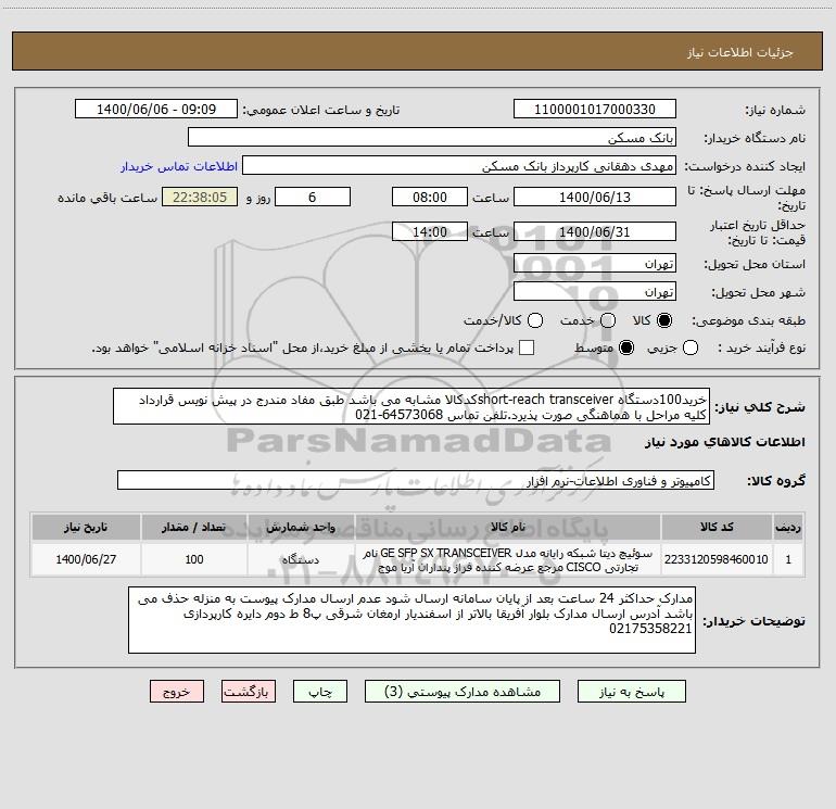 شرح کلی نیاز: خرید100دستگاه short-reach transceiverکدکالا مشابه می باشد طبق مفاد مندرج در پیش نویس قرارداد کلیه مراحل با هماهنگی صورت پذیرد.تلفن تماس 64573068-021