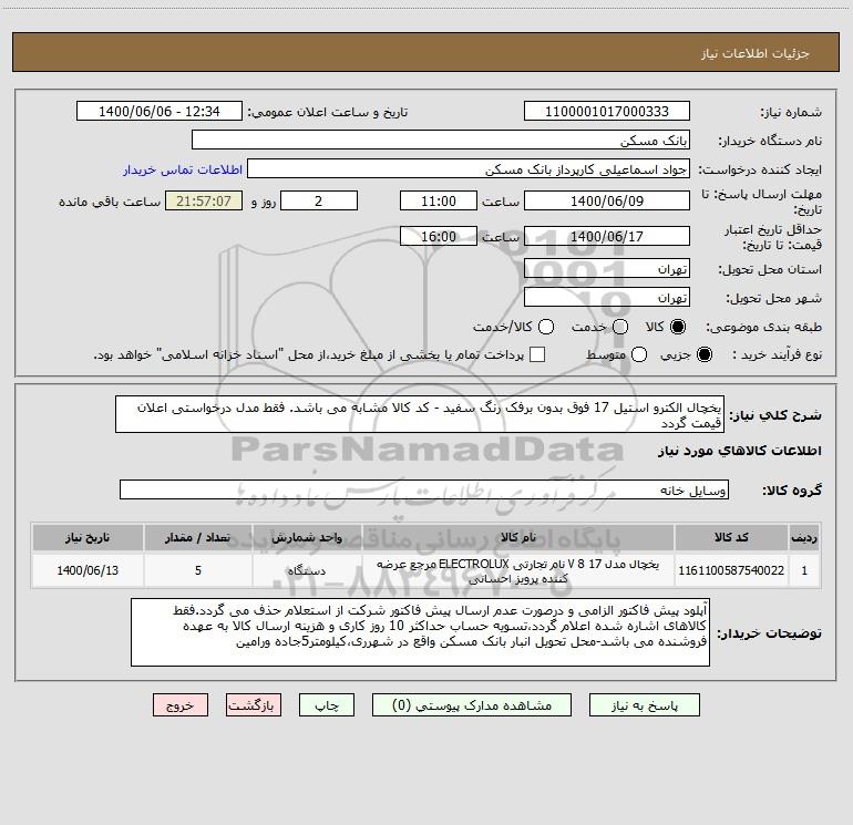 شرح کلی نیاز: یخچال الکترو استیل 17 فوق بدون برفک رنگ سفید - کد کالا مشابه می باشد. فقط مدل درخواستی اعلان قیمت گردد