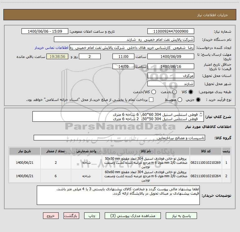 | 2 | 0821110010210264 | پروفیل تو خالی فولادی استیل 304 ابعاد مقطع 60x60 mm ضخامت 2/0 mm طول 6 m مرجع عرضه کننده کشت وصنعت توچین | شاخه | 6 | 1400/06/21 |