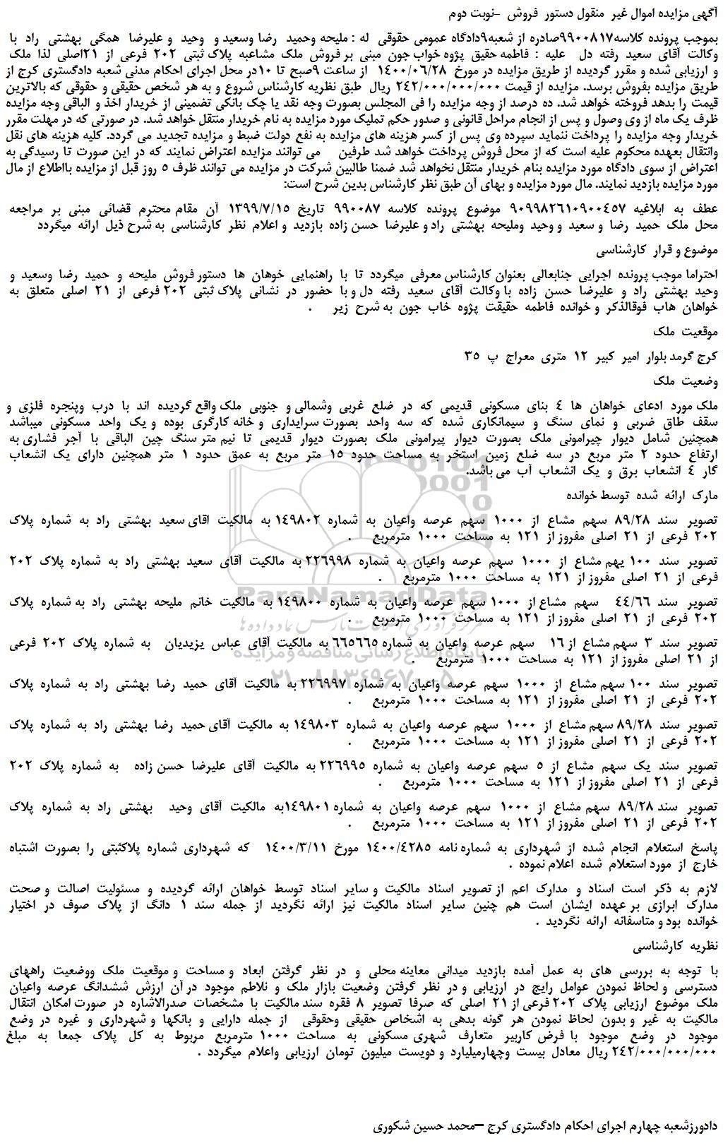 بموجب پرونده کلاسه9900817صادره از شعبه9دادگاه عمومی حقوقی  له : ملیحه وحمید  رضا وسعید و  وحید  و علیرضا  همگی  بهشتی  راد  با  وکالت  آقای  سعید  رفته  دل    علیه  :  فاطمه حقیق  پژوه خواب جون  مبنی  بر فروش  ملک  مشاعبه  پلاک ثبتی  202  فرعی  از  21اصلی  لذا  ملک  و ارزیابی شده و مقرر گردیده از طریق مزایده در مورخ  1400/06/28  از ساعت 9صبح تا 10در محل اجرای احکام مدنی شعبه دادگستری کرج از طریق مزایده بفروش برسد. مزایده از قیمت 242/000/000/000 ریال  طبق نظریه کارشناس شروع و به هر شخص حقیقی و حقوقی که بالاترین قیمت را بدهد فروخته خواهد شد. ده درصد از وجه مزایده را فی المجلس بصورت وجه نقد یا چک بانکی تضمینی از خریدار اخذ و الباقی وجه مزایده ظرف یک ماه از وی وصول و پس از انجام مراحل قانونی و صدور حکم تملیک مورد مزایده به نام خریدار منتقل خواهد شد. در صورتی که در مهلت مقرر خریدار وجه مزایده را پرداخت ننماید سپرده وی پس از کسر هزینه های مزایده به نفع دولت ضبط و مزایده تجدید می گردد. کلیه هزینه های نقل وانتقال بعهده محکوم علیه است که از محل فروش پرداخت خواهد شد طرفین    می توانند مزایده اعتراض نمایند که در این صورت تا رسیدگی به اعتراض از سوی دادگاه مورد مزایده بنام خریدار منتقل نخواهد شد ضمنا طالبین شرکت در مزایده می توانند ظرف 5 روز قبل از مزایده بااطلاع از مال مورد مزایده بازدید نمایند. مال مورد مزایده و بهای آن طبق نظر کارشناس بدین شرح است:
